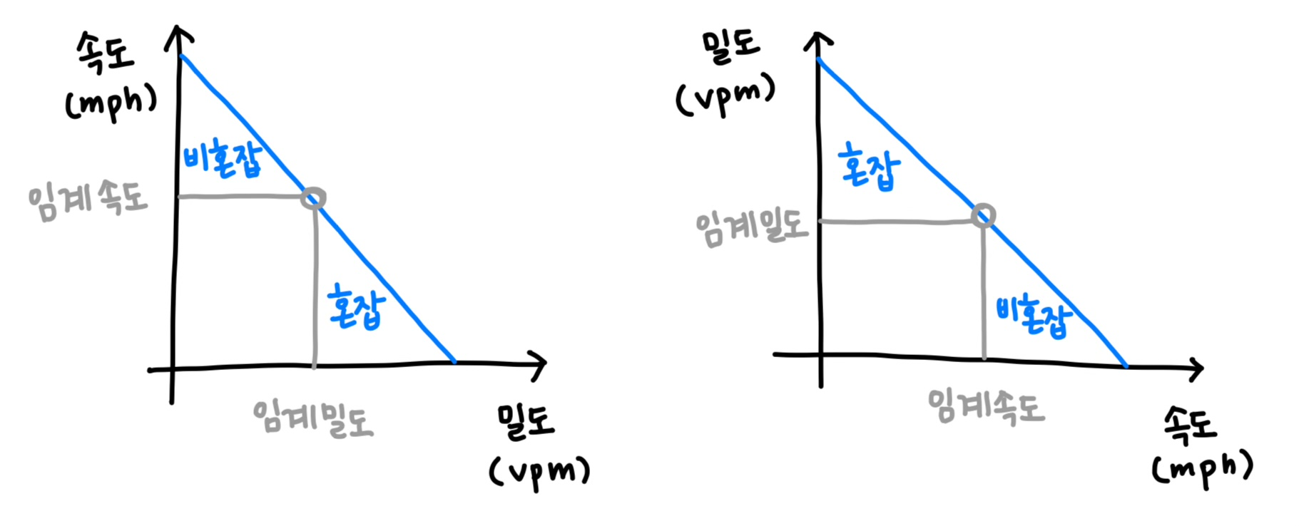 - 최대혼잡밀도 jam density: 혼잡이 극심해 차량이 전혀 움직일 수 없는 상태